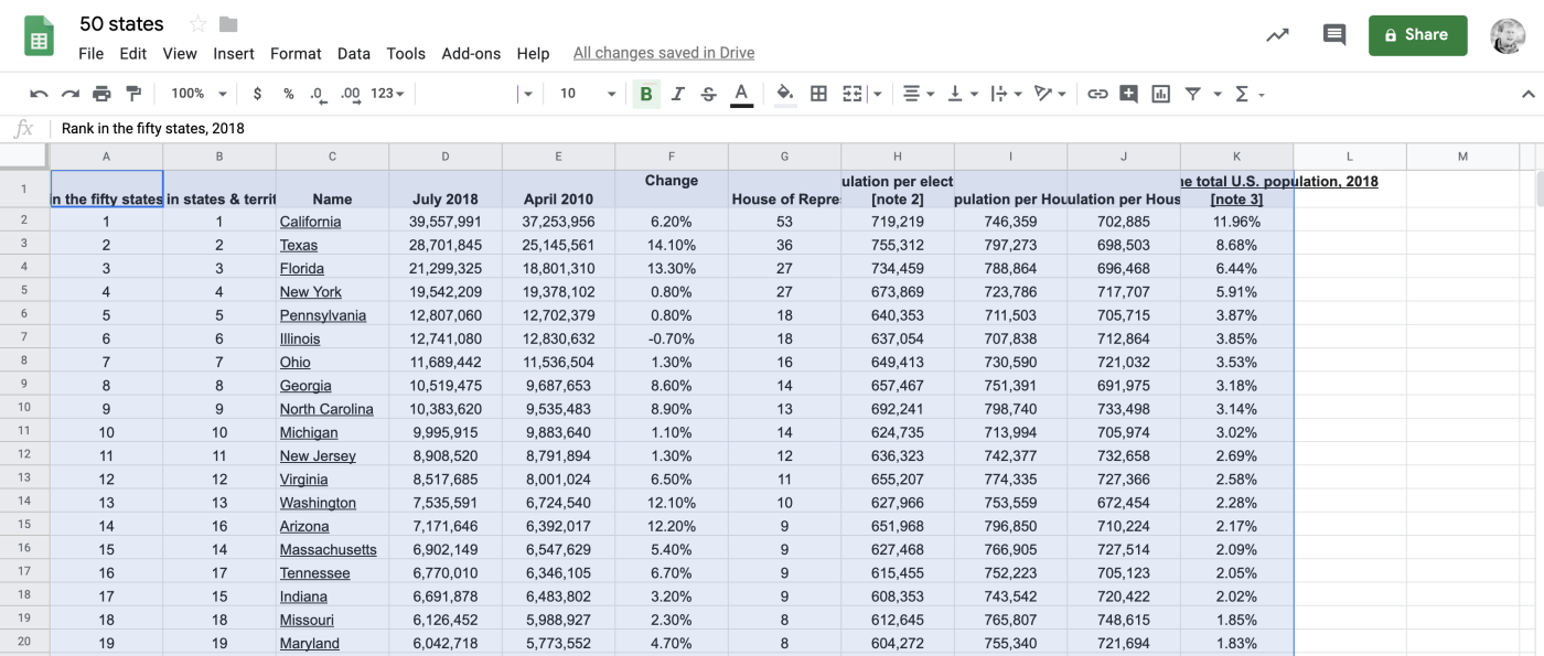 Let'south look at our example data again. If we desire to filter this spreadsheet to only show states and territories with fewer than one million people, equally of Apr 2010, nosotros tin can. Under Filter by condition cull Less than, so enter 1,000,000 as your value.